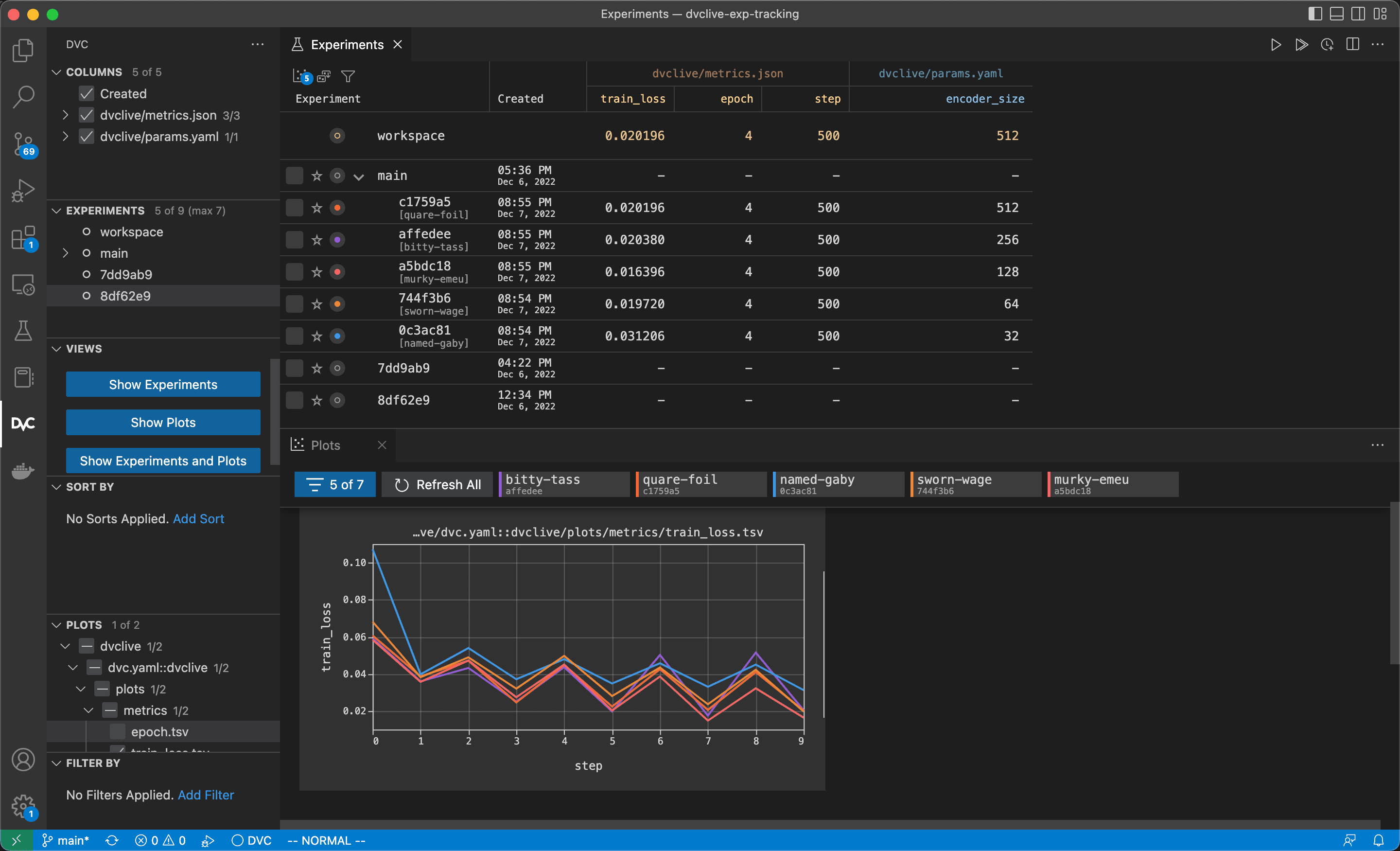 ─────────────────────────────────────────────────────────────────────────────────────$ dvc plots diff $(dvc exp list --name-only)Inside the