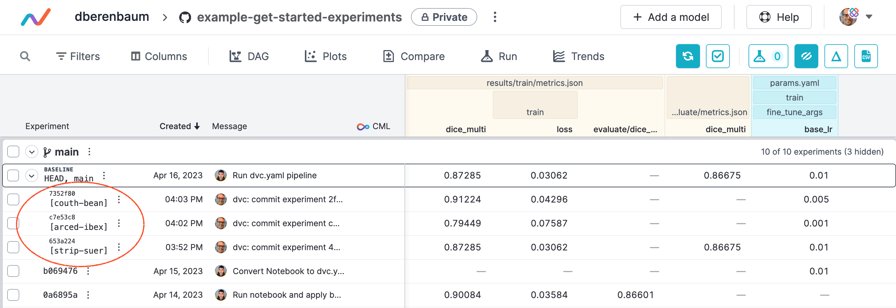 $ dvc pushIf you don't want to create a new Git branch and instead want to commit the experiment directly on top of your current Git branch, you can bring experiment results to your workspace.